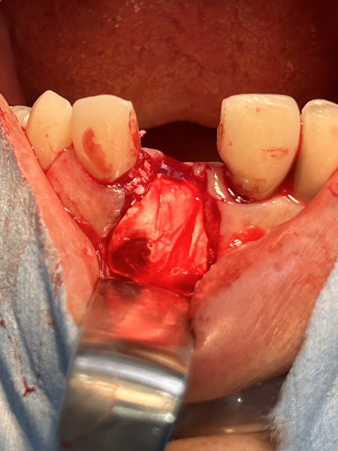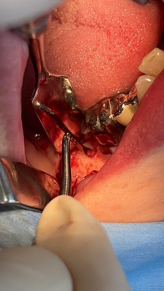 抜⻭したのは左上1番。プロービング検査すると唇側側の⾻がかなり深く吸収されており、抜⻭即時インプラントと同時にGBRを⾏いました。